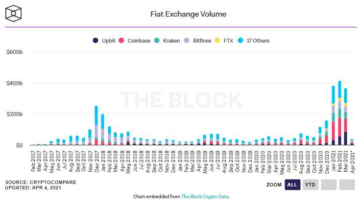 ปริมาณซื้อขายตลาด fiat exchange เท่ากับ $406.51 พันล้านเหรียญ ตลาดคริปโตชั้นนำที่รองรับสกุลเงินตรา ได้แก่ Coinbase (มีประมาณซื้อขาย 22%) Upbit (21%) และ Kraken (11%)