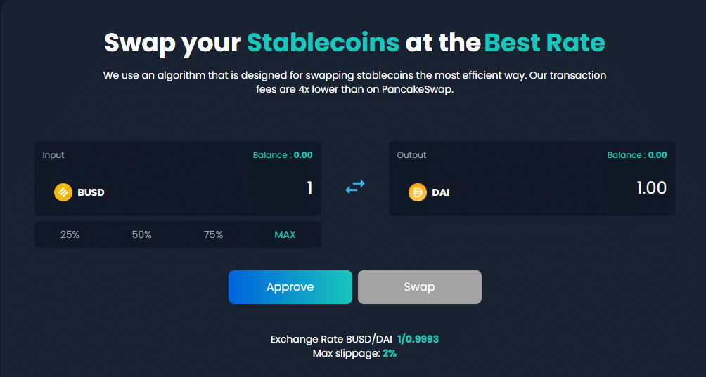 เป็นแพลตฟอร์ม DeFi บน Binance Smart Chain ฝีมือของคนไทย ที่มีจุดเด่นในการแลกเปลี่ยนเหรียญ stablecoin ที่ราคาเรตดีที่สุด คุณสามารถแลกเปลี่ยน ได้ทั้ง BUSD, USDC, USDT , DAI