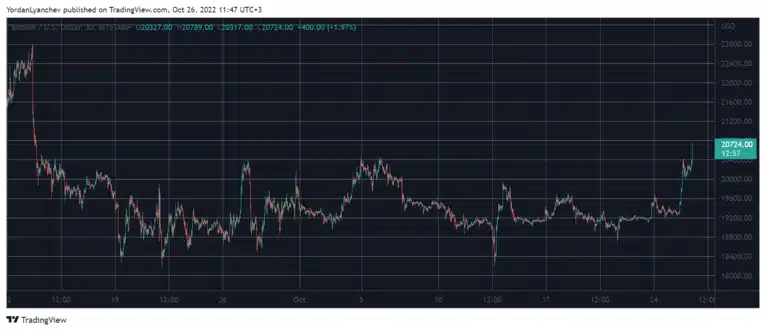 แม้ว่าจะลดลงเล็กน้อยในตอนแรก แต่สินทรัพย์ก็ได้ฟื้นตัวขึ้นใหม่อีกครั้งเมื่อไม่กี่นาทีที่แล้ว และพุ่งขึ้นสู่ระดับ 20,615 ดอลลาร์ ได้เป็นครั้งแรกนับตั้งแต่ล้มเหลวในช่วงกลางเดือนกันยายน อย่างไรก็ตาม Arthur Hayes เตือนผู้คนในชุมชน ไม่ให้ตื่นเต้นมากจนเกินไป