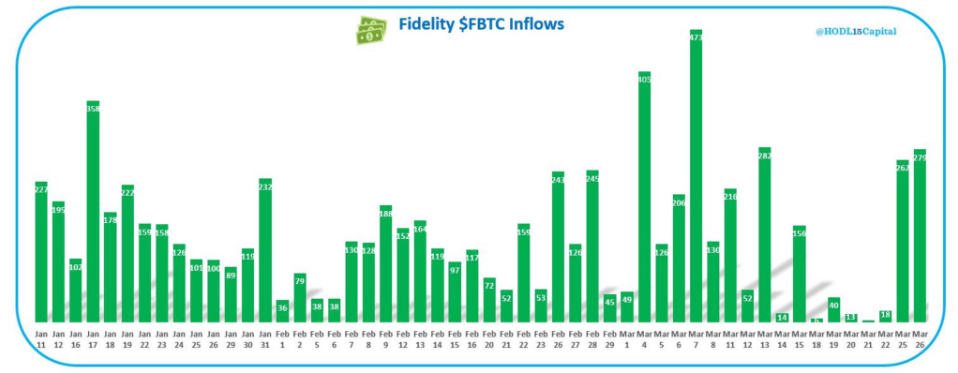 กองทุนของ Fidelity สร้างกระแสเงินทุนไหลเข้ารายวันสูงสุดนับตั้งแต่วันที่ 13 มีนาคม โดยมีเงินทุนถึง 279.1 ล้านดอลลาร์ในวันที่ 26 มีนาคม ซึ่งส่งผลให้ยักษ์ใหญ่ด้านการลงทุนเพิ่มการถือครองอีก 4,000 BTC นับเป็นวันที่สองติดต่อกันที่กองทุนได้รับเงินทุนไหลเข้าเกินกว่า 260 ล้านดอลลาร์