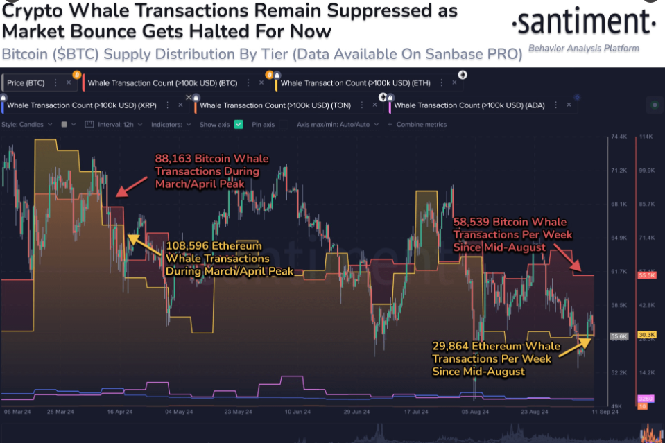 หลังจากที่ราคาของ Bitcoin ขึ้นไปแตะจุดสูงสุดในเดือนมีนาคมที่ 73,679 ดอลลาร์สหรัฐฯ การทำธุรกรรมของเหล่า Whales หรือกลุ่มนักลงทุนที่ถือ Bitcoin จำนวนมาก (อย่างน้อย 10,000 BTC) ก็ลดลง ข้อมูลล่าสุดจาก Santiment ระบุว่าการทำธุรกรรมรายสัปดาห์ที่มีมูลค่าเกิน 100,000 ดอลลาร์สหรัฐฯ ลดลงถึง 33.6% นับตั้งแต่กลางเดือนสิงหาคม